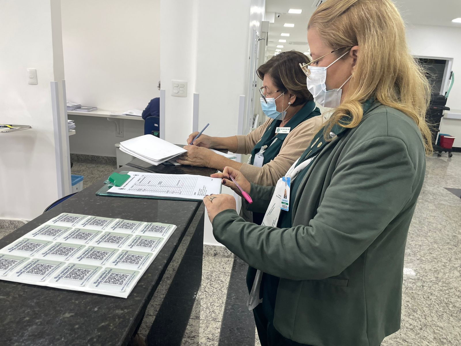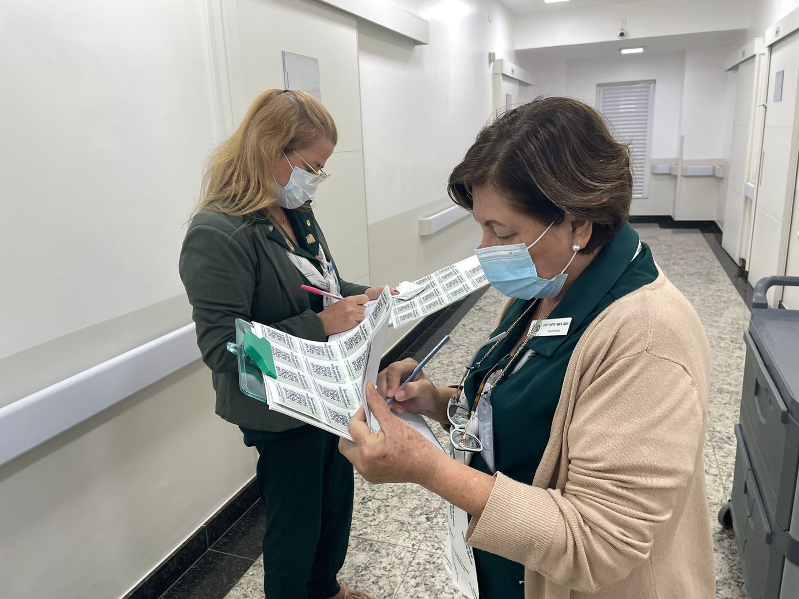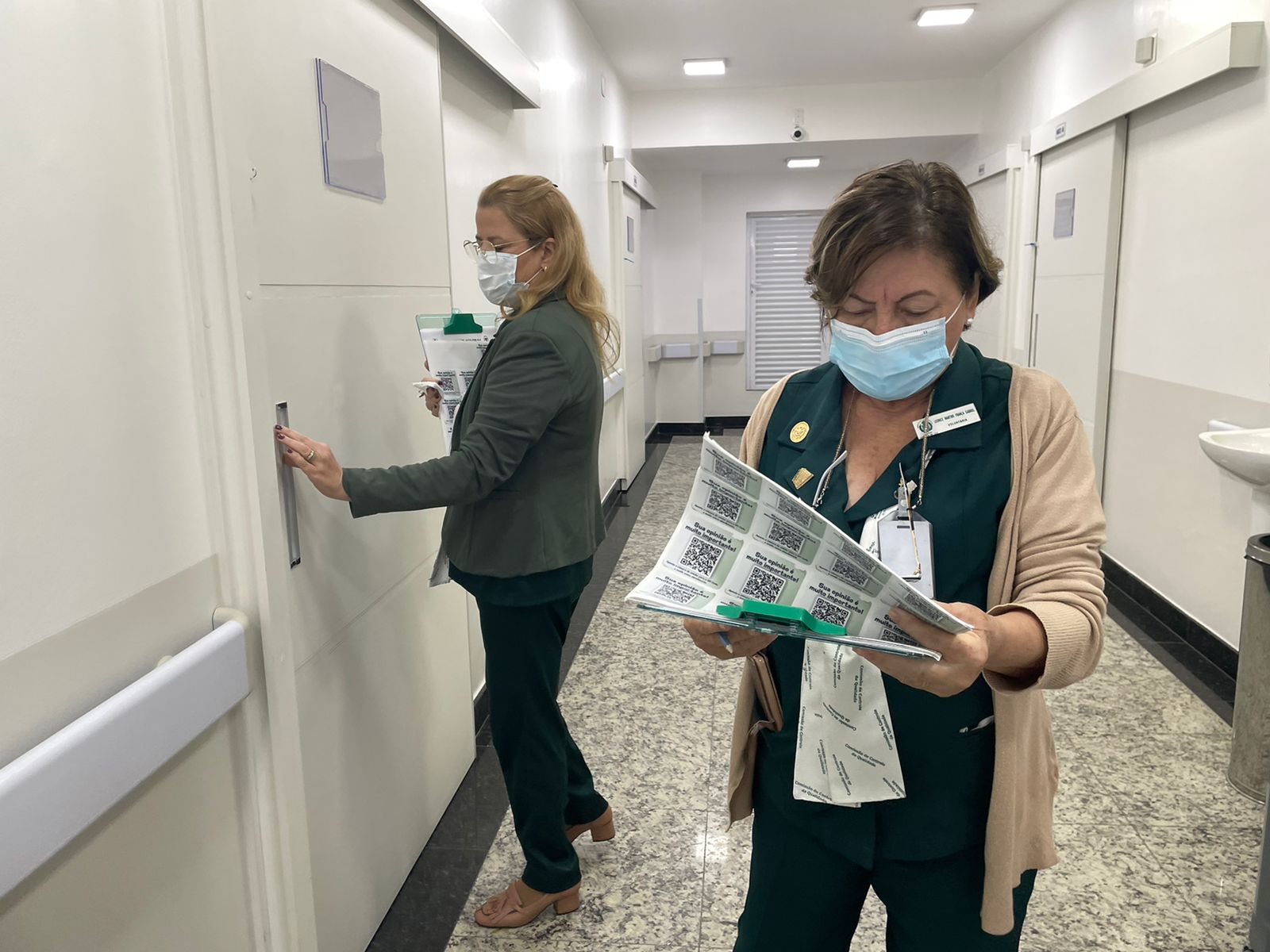Os adesivos com QR Code já estão sendo instalados pelos voluntários da Comissão de Controle da Qualidade. As voluntárias Marise Céspedes Tavolaro e Leonice Martins França Gabriel, coordenadora da C.C.Q, destacam o envolvimento de todas as equipes para a implantação deste sistema, em especial a T.I, a Enfermagem e a Recepção.